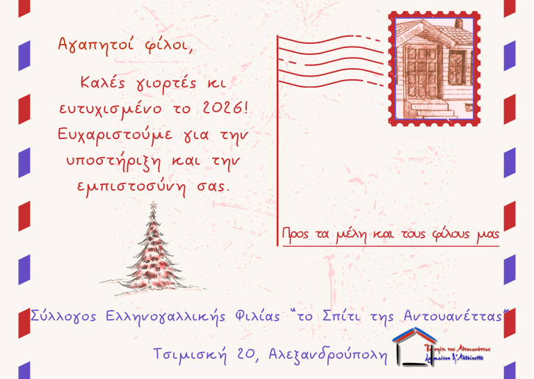 Χρόνια πολλά, θερμές ευχές για υγεία και ειρήνη από το Δ Σ. του Συλλόγου Ελληνογαλλικής Φιλίας “la Maison d’ Antoinette”!